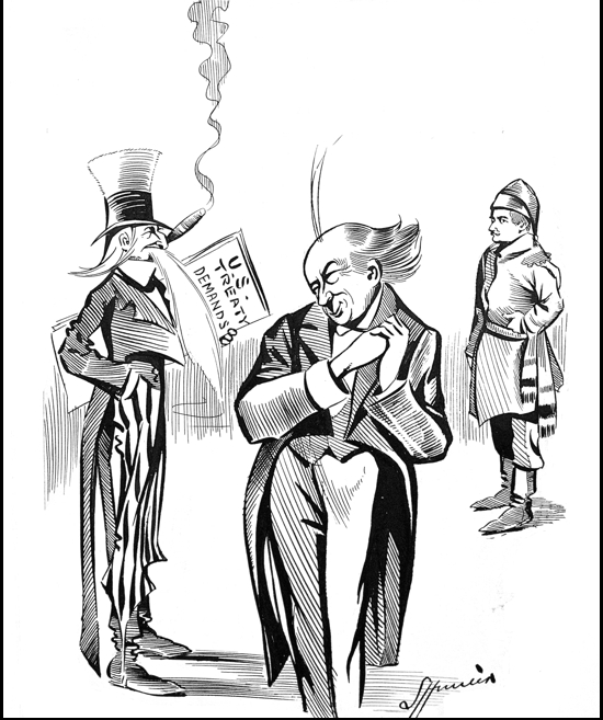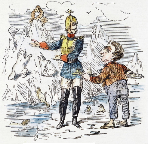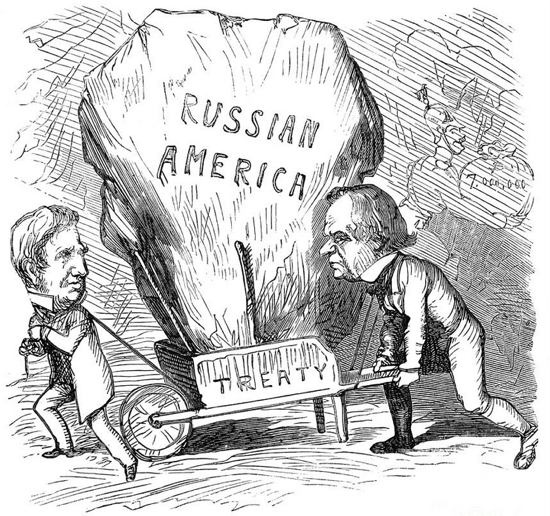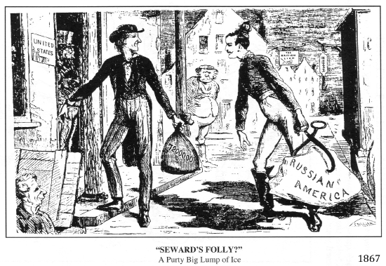 RUSSIAN STRANGER: I say, little boy [Secretary of State William Seward], do you want to trade? I've got a fine lot of bears, seals, icebergs and Esquimaux–They're no use to me, I'll swap 'em all for those boats you've got." [Billy, like other foolish boys, jumps at the idea.]