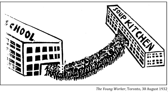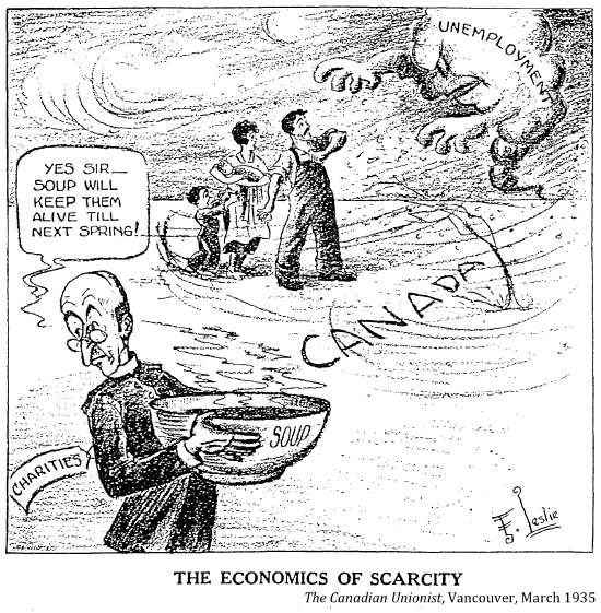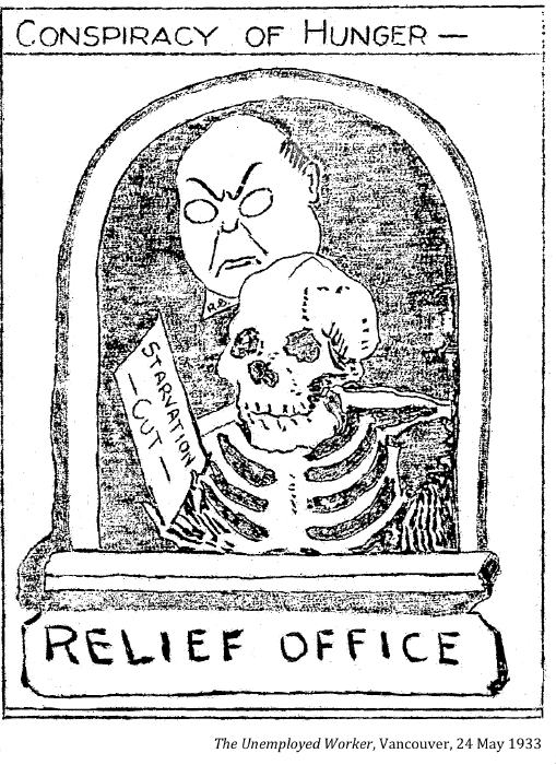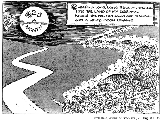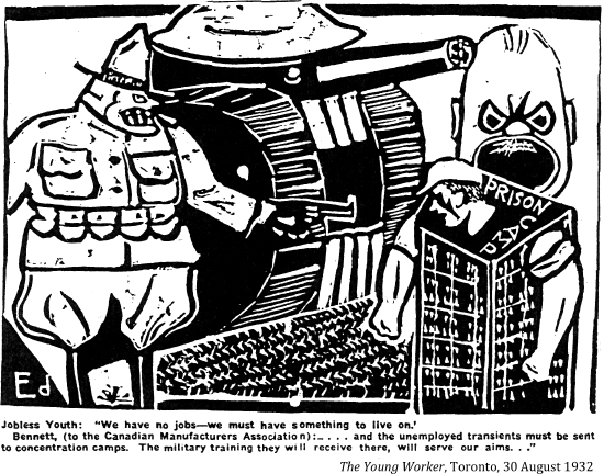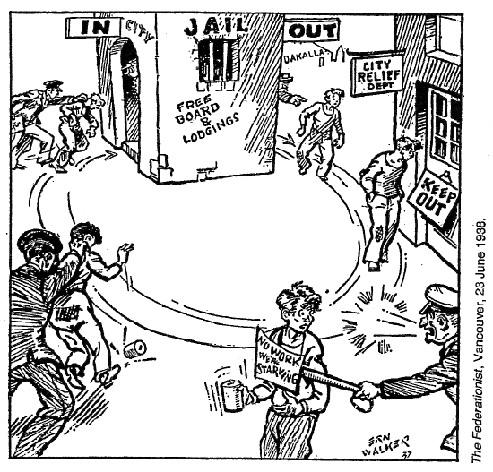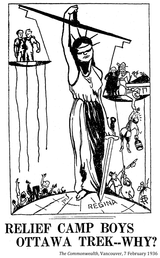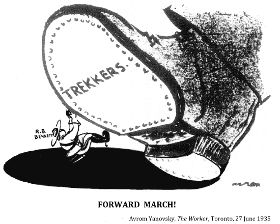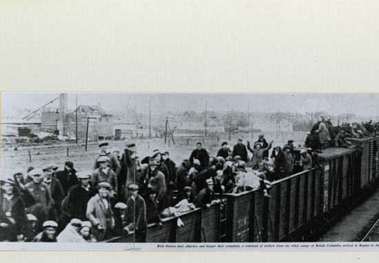 "The men of the railway unions co-operated with the jobless trekkers on the long and dangerous freight journey across Canada. When the jobless army pulled into the town or city to rest for the night, citizens and civic authorities met them with a friendly welcome¬¬––and with food. Anticipating their arrival, the working women in Canada's cities and towns baked and cooked piles of food which they had solicited from the store keepers. To all except the politically bankrupt, ruthless leaders of big business and their "iron heel" government, these jobless workers were 'our boys,' and they were treated as such."