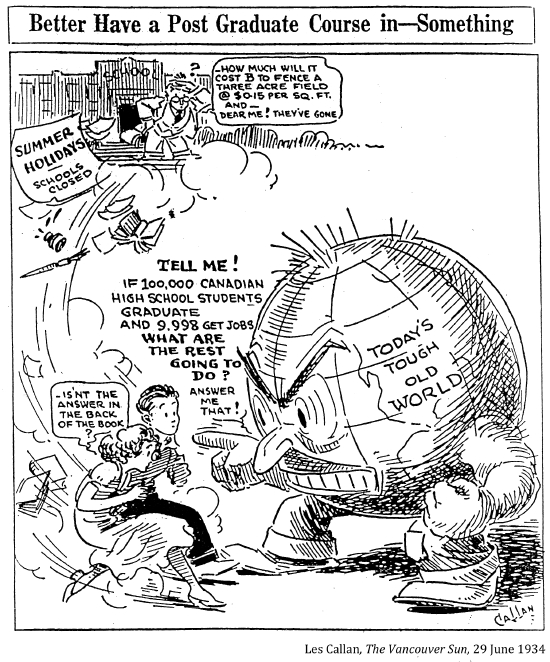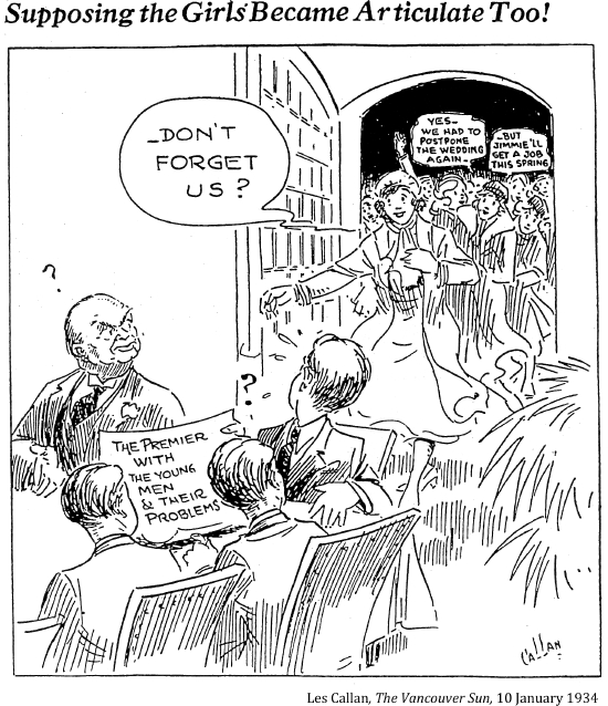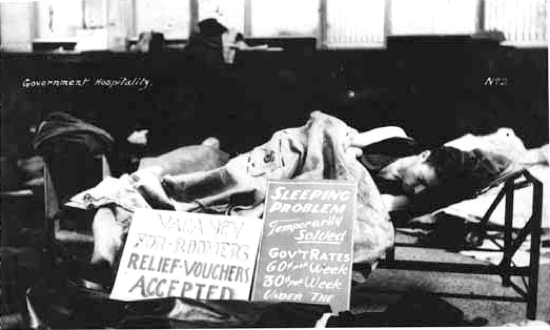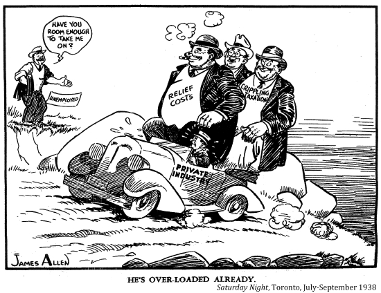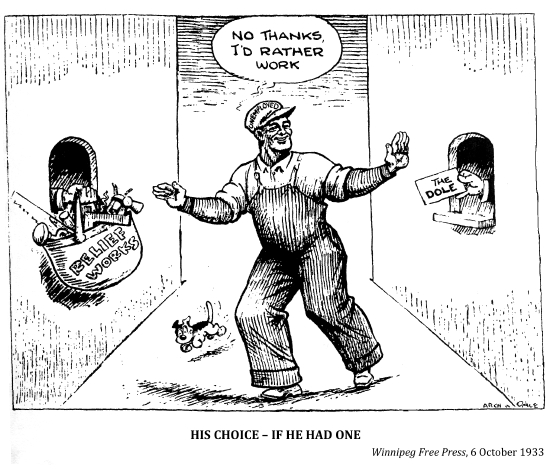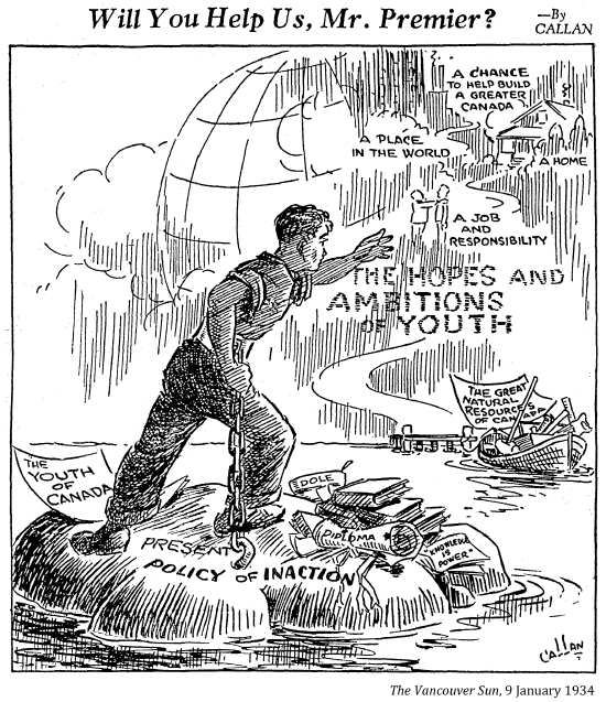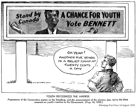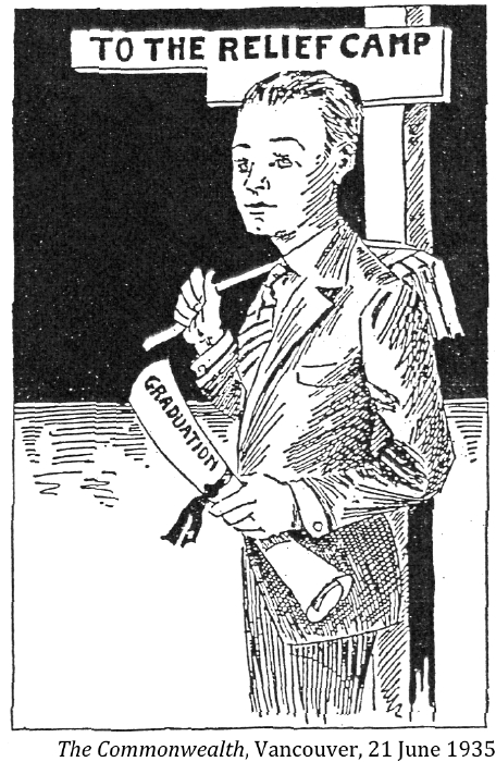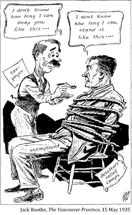 "Getting a job was the greatest achievement bar none in the days of my youth. I know because I knocked on doors and answered ads and filled in forms for two years, only to be told there was nothing, nothing, nothing, although that wasn't always the reply. 'Leave you name and we'll let you know' –– and like a goof, you became hopeful although you knew there was no hope, there as nothing. A job meant everything in the thirties: it was an escape from the dreariness of the depression, and a chance to live it up after all the aching dullness of nothing to do, nowhere to go. Cyril Lee's description of life in a relief camp –– an indefinite prison sentence–– was a good description of unemployment; even outside the camp, life was like a prison sentence."