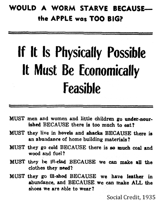 "There are 731,000 in Alberta and it's our duty to look after them. It's funny in this province of ours there is a law that prevents you starving or ill-treating a dog, cow, or any other animal, and yet they allow people to go hungry, ill-clothed and suffer. Social Credit with its basic dividend to every man and woman of $25.00 per month starts out with the corrective measure at once. It places purchasing power in the hands of consumers."