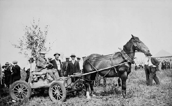 Rt. Hon. W.L. Mackenzie King driving a wagon ("Bennett Buggy"). LAC C-087860, 27 July 1933