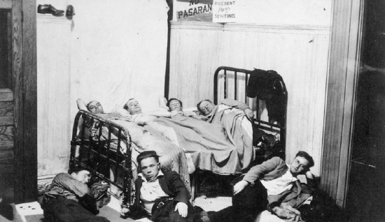 Group of men, possibly members of the Mackenzie-Papineau Battalion, sharing the same bed during the Depression. Groupe d'hommes, possiblement de membres du battalion Mackenzie-Papineau, partageant le meme lit pendant la Dépression. LAC C-013236, 1936