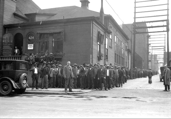 Rev. Andrew Roddan standing in front of men lined up for food outside the First United Church, September 1931, City of Vancouver Archives AM54-54-S4--Re N5.2
