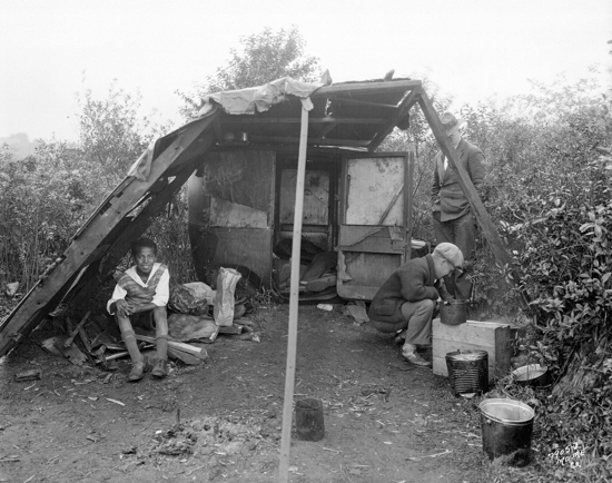 Three men in shelter in the 'jungle' at the City dump, September 1931, City of Vancouver Archives, AM54-54-S4--Re N3.2