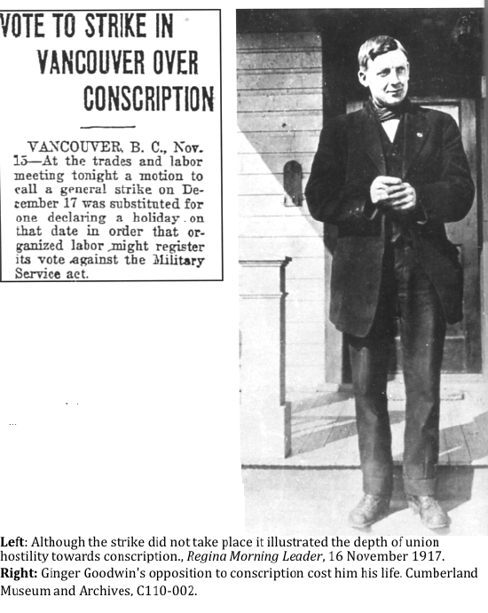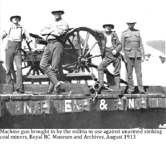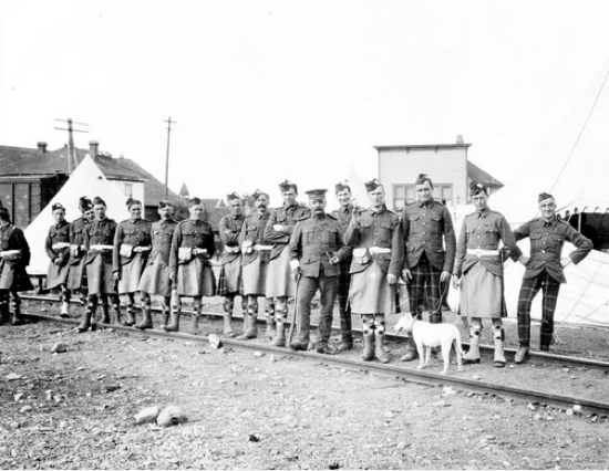 Members of the 72nd Regiment, Seaforth Highlanders of Canada, and their mascot; part of the Nanaimo civil aid force, sent to break the strike by Dunsmuir coal miners, 1913, BC Archives A-03183