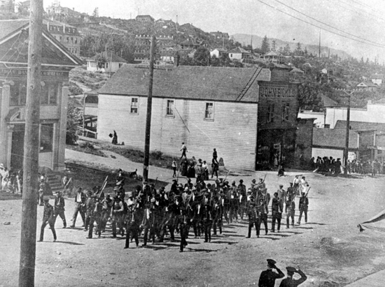 Ladysmith; Dunsmuir Coal Mine Strikers Being Marched To Jail, 1913, BC Archives E-01194,