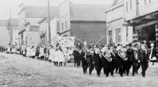 Mineworkers. their wives and children, parade in Ladysmith during the "Big Strike"; Dunsmuir coal miners, 1913, BC Archives E-02631