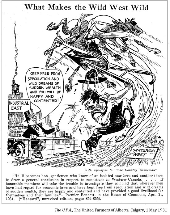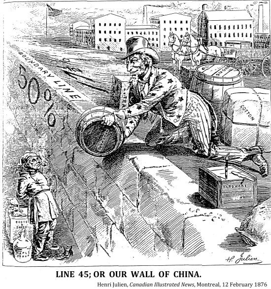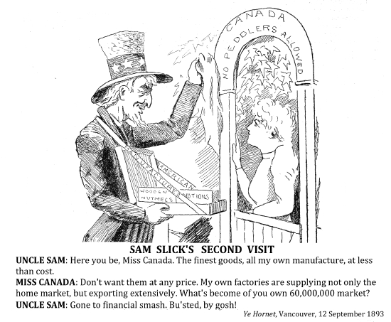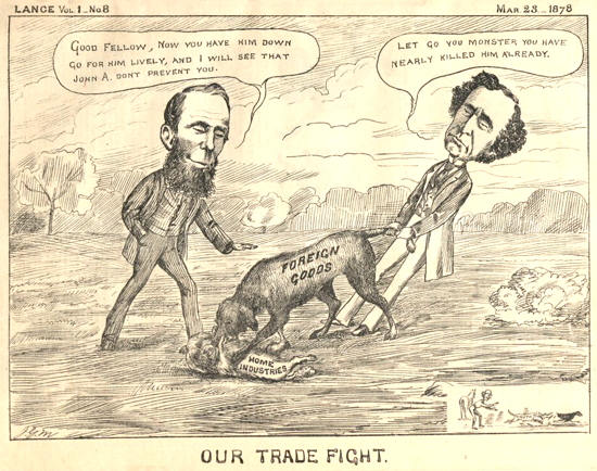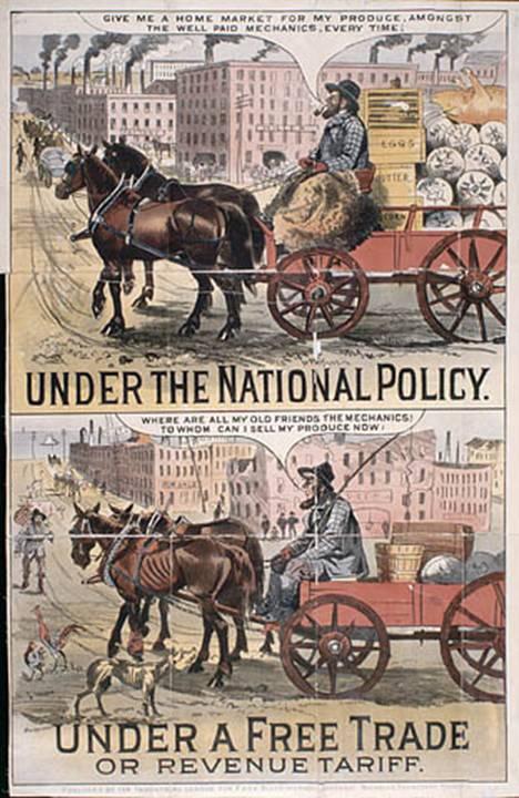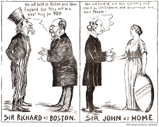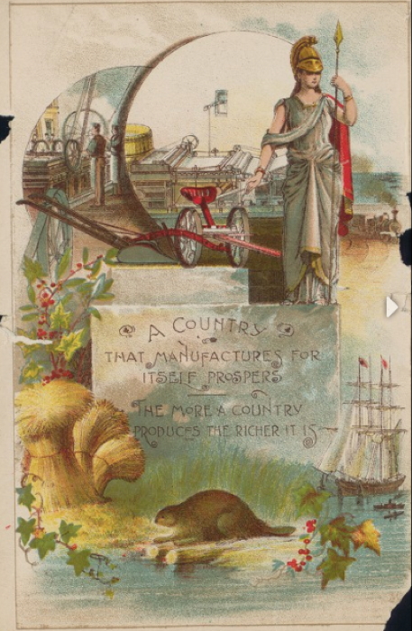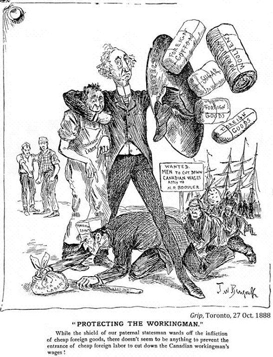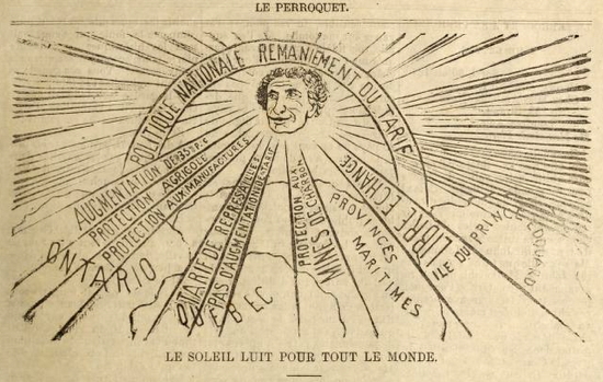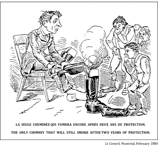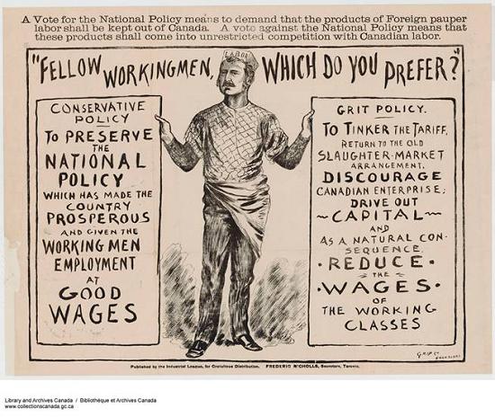 "Canadians are fast sinking into the position of being mere hewers of wood and drawers of water for the great nation dwelling to the south of us . . . So we inaugurated the National Policy. . . Almost as if by magic . . . stagnation and apathy and gloom, aye, and want and misery too, gave place to activity and interprovincial prosperity."
