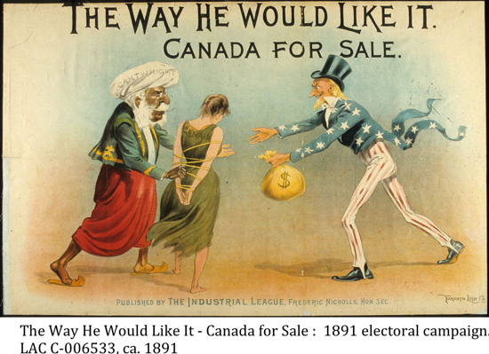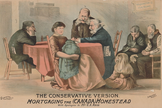 The Conservative Version - Mortgaging the (Canadian) Homestead with Apologies to Mr. G. A. Reid : 1891 electoral campaign. LAC, Acc. No. 1983-33-1090, Samuel Hunter, 1891