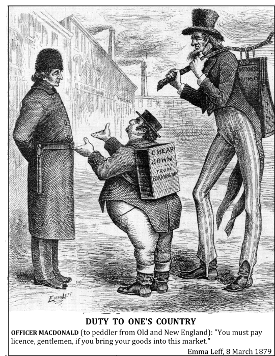 When there is a large body of successful and prosperous manufacturers, the farmer will have a home market for his produce, and the manufacturer a home market for his goods. . . We have no manufacturers here. We have no work-people; our work-people have gone off to the United States. There Canadian artisans are adding to the strength, to the power and to the wealth of a foreign country instead of adding to ours."