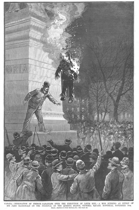 Canada – Indignation of French-Canadians over the execution of Louis Riel – A mob burning an effigy of Sir John A. Macdonald on the pedestal of the Queen's statue, Victoria Square, Montreal, November 16.