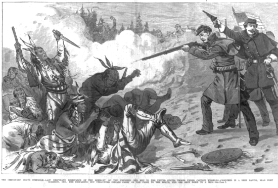 The Cheyennes' death struggle - last desperate resistance of the remnant of the frenzied Red Men to the United States troops under Captain Wessells in a deep ravine, near Fort Robinson, Neb., The National Police Gazette, 8 Feb. 1879 LC2003690107