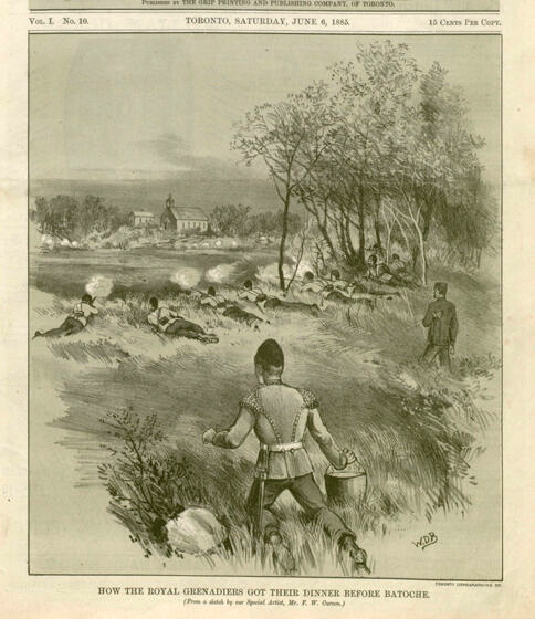 Midnight Tramp of the Royal Grenadiers. William Daniel Blatchly, The Illustrated War News, Toronto, 18 April 1885, LAC C-007684