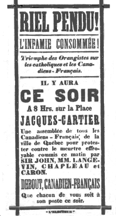an assembly of all French Canadians in the city of Québec to protest against the appalling murder committed this morning by Sir John, MM. Langevin, Chapleau and Caron.