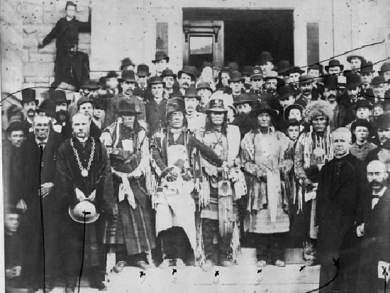 Presentation of an address to Chief Crowfoot and other Indian Chiefs by the City of Ottawa. Front row: (left to right) - W.P. Lett; His Worship Mayor McDougal; One Spot, sub-chief of the Bloods; Three Bulls, half-brother of Crowfoot; Chief Crowfoot; Red Cloud, Chief of the Bloods, North Axe, Chief of the Piegans; Rev. Father Lacombe, Ald. F.R.E. Campeau. LAC, PA-066624, 1886