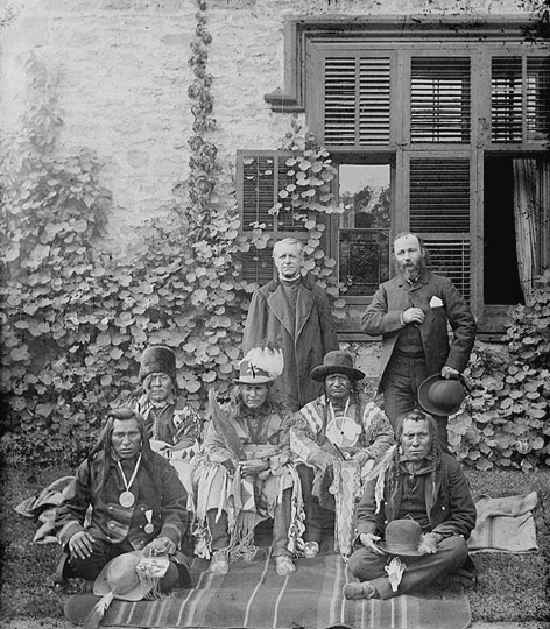 Blackfeet at Earnscliffe, "Front row", left to right: North Axe, Peigan Chief, One Spot, Blood sub-chief. "Middle row", left to right: Three Bulls, half brother of Crowfoot, Crowfoot, Blackfoot Chief, Red Cloud, Blood Chief. "Back row", left to right: Father Lacombe, John L'Heureux, interpreter, LAC, PA-045666, 1886