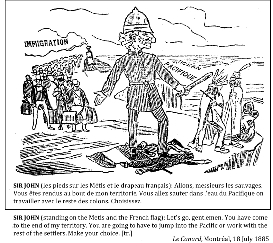 "Progress – railways, the telegraph, mechanized farming, immigrants from Ontario and later Europe, and an organized government, police and legal system – was inevitable, and neither the Métis nor the Indians could continue to live in their traditional ways."