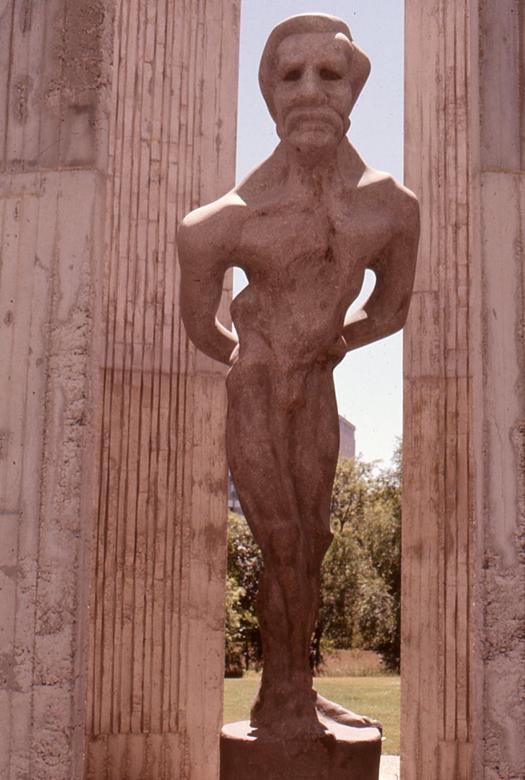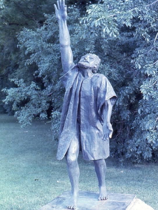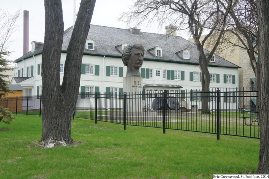 "The statue depicts Riel clad in a simple, but revealing, cloak, his head and right hand thrust heavenward in a final set of defiance before his people's surrender to the troops of General Middleton at Batoche."