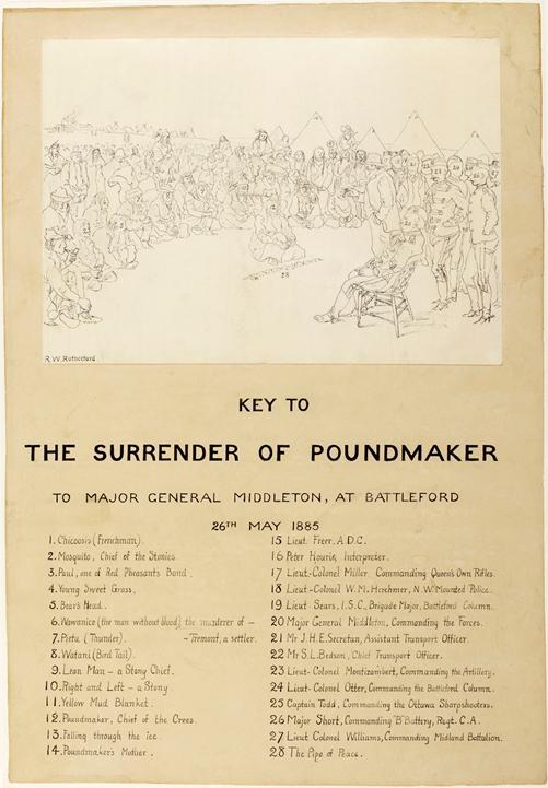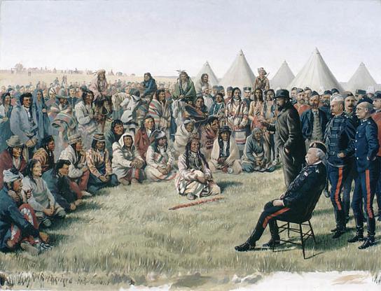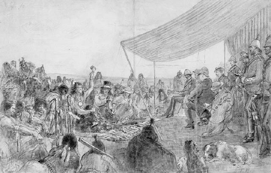 "If the Police had not come to the country, where would we be all now? Bad men and whiskey were killing us so fast that very few indeed of us would have been left today. The Police have protected us as the feathers of the bird protect it from the frosts of winter. . . I am satisfied. I will sign the treaty."