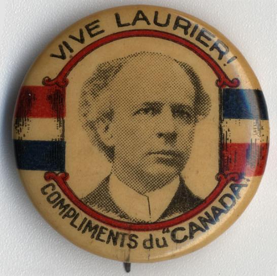 Small sized lapel button showing a portrait of Sir Wilfrid Laurier, 1896. Library and Archives Canada, Acc. No. R1300-1012