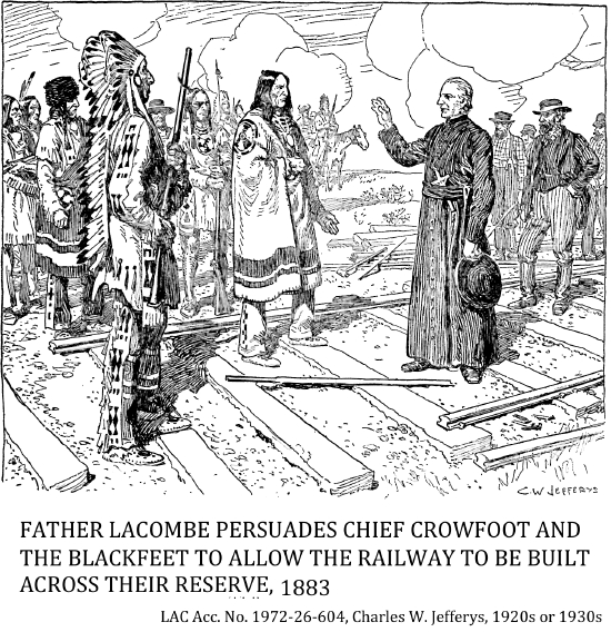 [In July 1886, the Blackfoot leader met Sir John and Lady Macdonald at the Gleichen rail stop in present-day southern Alberta, when the couple crossed the country on the newly completed Canadian Pacific Railway. During the short meeting, Crowfoot expressed an interest in visiting the Premier in Ottawa.]