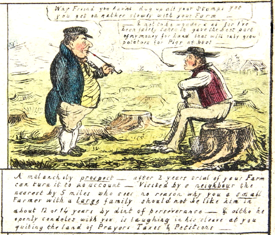 A melancholy prospect – after 2 years trial of your Farm can turn it to no account – Visited by a neighbour the nearest 5 miles who sees no reason why you a small Farmer with a large family should not be like him in about 12 or 14 years by dint of perseverance – & altho he openly condoles with you is laughing in his sleave at you quitting the land of Prayers, Taxes & petitions –