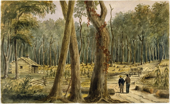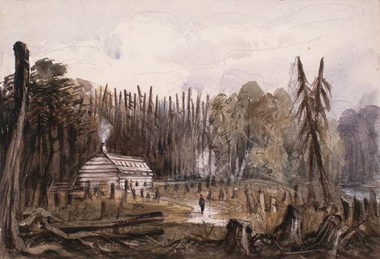 Cabin in the Woods. Cabine dans la forêt.LAC, Acc. No. 1956-62-123 Millicent Mary Chaplin 1838-1842