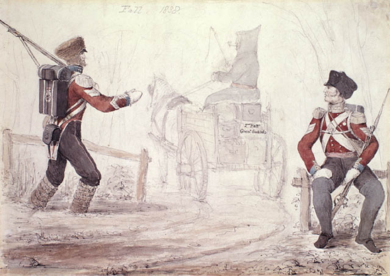 1837 Officers of the Second Battalion, Grenadier Regiment of Foot Guards. Officiers du 2e Bataillon du Régiment d'infanterie des grenadiers. LAC, 1970-188-1497 Collection de Canadiana W.H. Coverdale. James Hope- Wallace 1838. The Grenadier Guards were brought from England to suppress the rebellions of 1837-38.