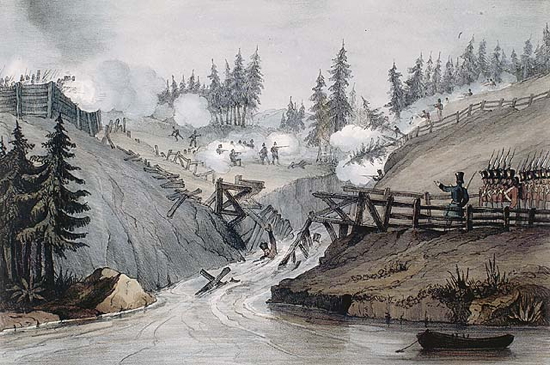 1837 11 25 Défilé fortifié. Le colonel Wetherall avançant pour prendre Saint-Charles, 25 novembre 1837. A Fortified Pass. Colonel Wetherall Advancing to the Capture of St. Charles, 25th November, 1837. LAC, Acc. No. 1992-566-5, Charles Beauclerk 1840