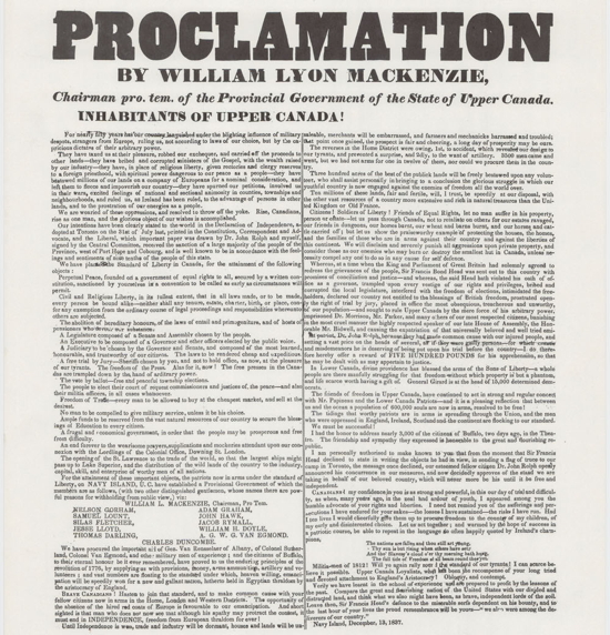 "Canadians? Do you love freedom? I know you do. Do have oppression? Who dare deny it? Do you wish perpetual peace, and a government founded upon the eternal heaven-born principle of the Lord Jesus Christ––a government bound to enforce the law to do to each other as you would be done by? Then buckle on your armour, and put down the villains who oppress and enslave our country . . . One short hour will deliver our country from the oppressor; and freedom in religion, peace and tranquility, equal laws and an improved country will be the prize . . . Up then, brave Canadians! Get ready you rifles, and make short work of it."