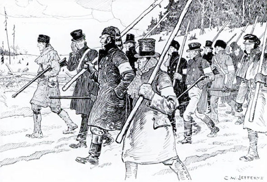 Rebels Marching Down Yonge Street to Attack Toronto, December, 1837. LAC, 1972-26-706. Charles W. Jefferys, 1920s or 1930s?