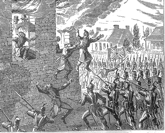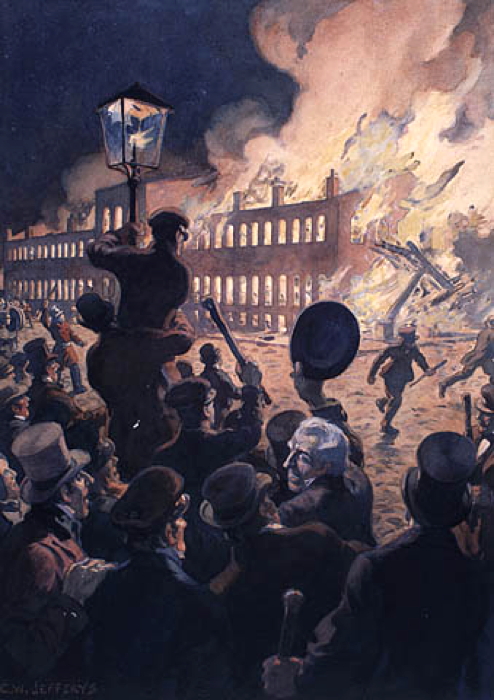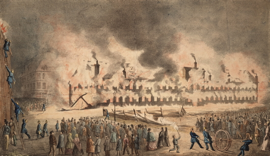 Feu des édifices du Parlement à Montréal en 1849. Burning of the Parliament buildings, Montreal in 1849. LAC, Acc. No. 1972-26-766, Charles William Jefferys ca. 1925