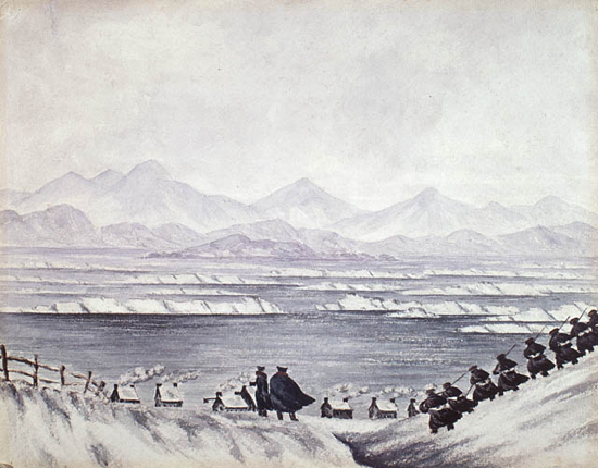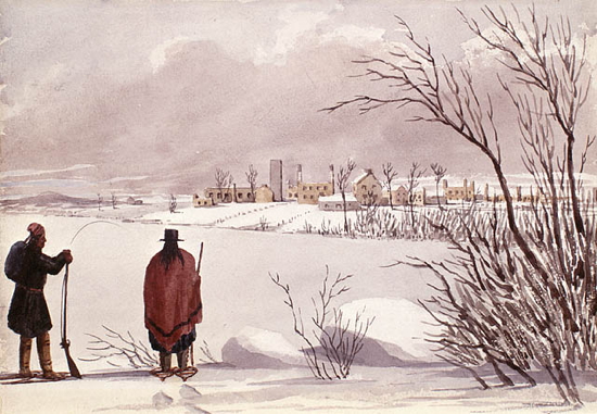 St. Lawrence River in Winter, the 43rd Regiment Marching to Canada from New Brunswick / Le Saint-Laurent en hiver, marche du 43ième Régiment du Nouveau Brunswick. LAC C-005207, Richard George Augustus Levinge, 23 December 1837