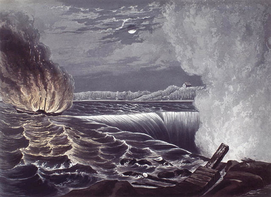 Burning steamer Caroline going over the Falls of Niagara. LAC Acc. No. 1939-447-48, c.1838