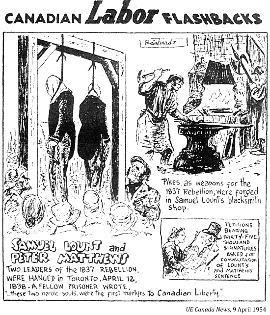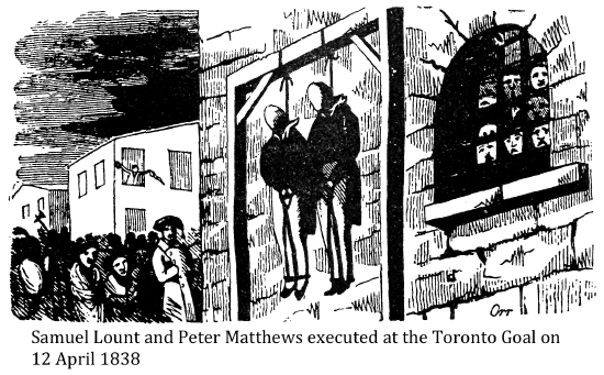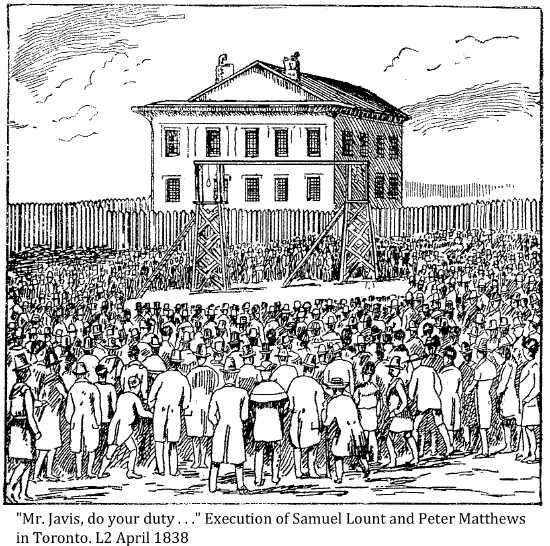 "At eight o'clock today, Thursday, 12th April, 1838, Lount and Mathews were executed. The general feeling is in total opposition to the execution of those men. Sheriff Jarvis burst into tears when he entered the room to prepare them for execution. They said to him very calmly, 'Mr. Jarvis, do your duty, we are prepared to meet death and our Judge."