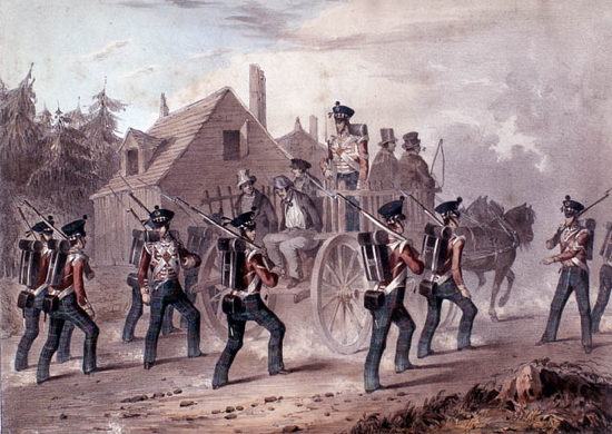 Le 71e Régiment de la Highland Light Infantry : lourd attirail de route. 71st Regiment, Highland Light Infantry: Heavy Marching Order with prisoners captured during the rebellion. LAC, 1991-116-4, James Henry Lynch 1840-1844