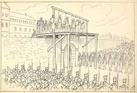 1839 02 15 Execution of rebels in front of the Montreal Gaol. LAC, Acc. No. 1989-466-61, drawing by Henri Julien, 1852-1908