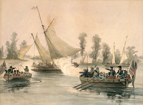 1840 Engagement in the Thousand Islands. Engagement dans les Mille-Îles., LAC, R13133-298, John Richard Coke Smyth 1840 During the Patriot War in 1837-1838 there were acts of piracy among the 1000 Islands.