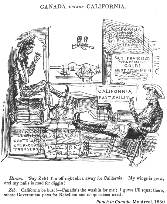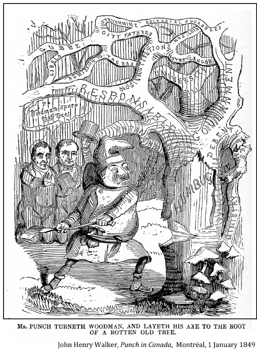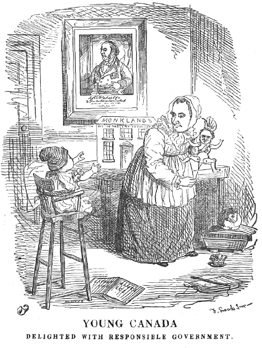 Young Canada delighted with Responsible Government. Jeune Canada ravi par le gouvernement responsable. Punch in Canada, Montreal, 3 February 1849, LAC, C-092201, 1849-1850