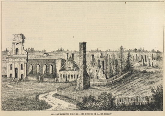 Vue d'une partie des ruines du Village de St. Benoît,. Depicting View Of Aftermath Of Fight & Fire In St. Benoît, Québec, 1838. J.J. Girouard visited St. Benoît between his periods of incarceration. LAC, Acc. No. 1984-81-73, Jean-Joseph Girouard 1838