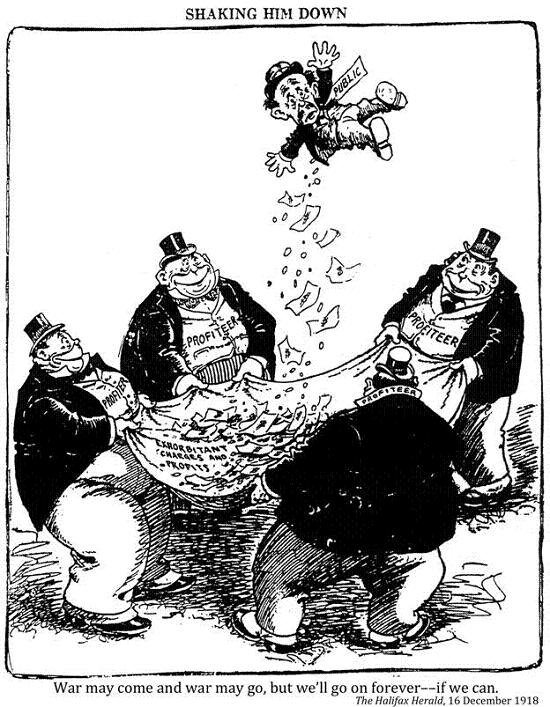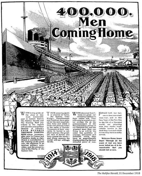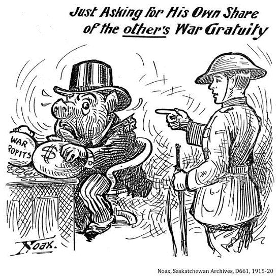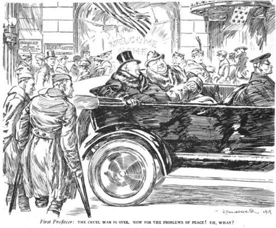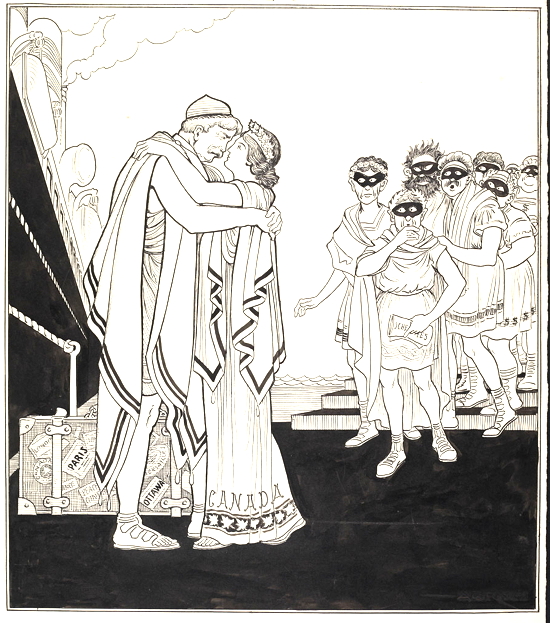 Ulysses Borden returns from his wonderful travels. / Penelope Canada: - Welcome Ulysses! I'm so glad you're home. During your / absence treacherous suitors and aspirants for your place, schemers, / food speculators, profiteers and foreign Bolshevist agitators have / been annoying me horribly and causing general unrest, / particularly the food speculators. Be brave! Be firm! And / get after them. The people are with you in this. / Homer up to date. A.G.Racey, LAC acc. no. 1926-007-5, ca. 1919
