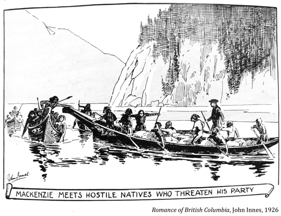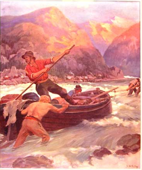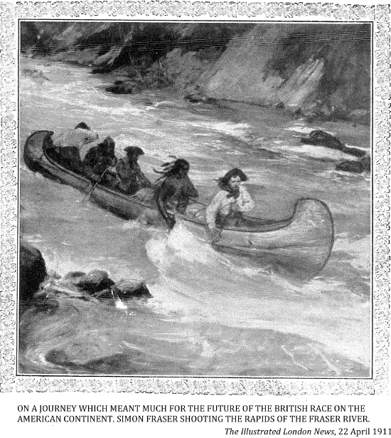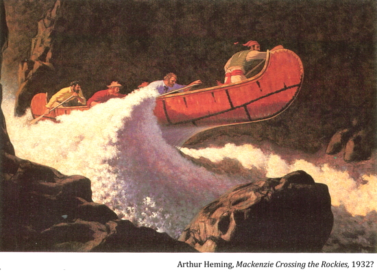 Simon Fraser Descending the Fraser River, 1808. Simon Fraser descend le fleuve Fraser, 1808. LAC Acc. No. 1972-26-6, Charles William Jefferys, 1920s or 1930s?