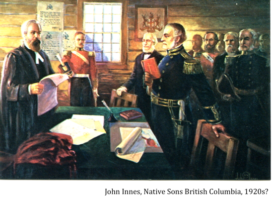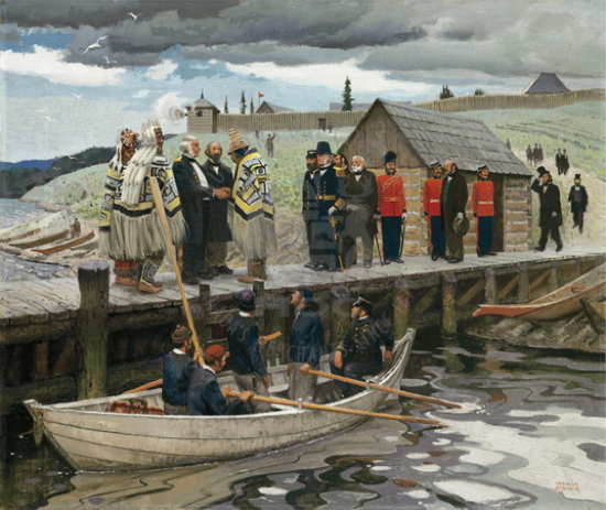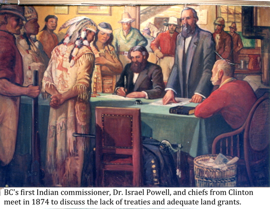 [The man seated at the head of the table in the red uniform is B.C.'s Indian commissioner. It depicts a famous scene from the 1874 meeting of Powell with 12 Clinton-area tribes, where Powell listened to and discussed various issues with each of the chiefs, in particular the lack of treaties and inadequate size of land grants. Matthew Baillie Begbie is standing opposite a chief. Powell unsuccessful championed proper reserves four times the size proposed by the province.]