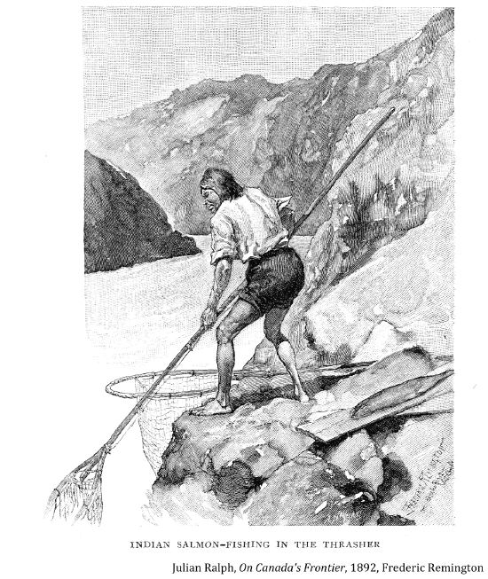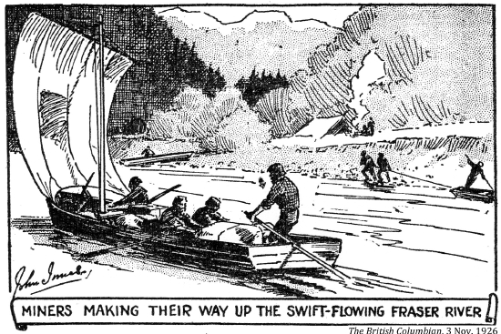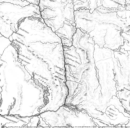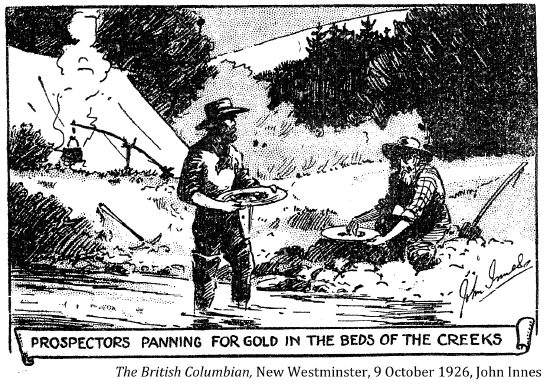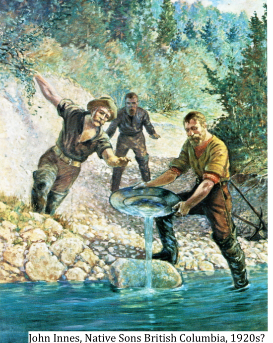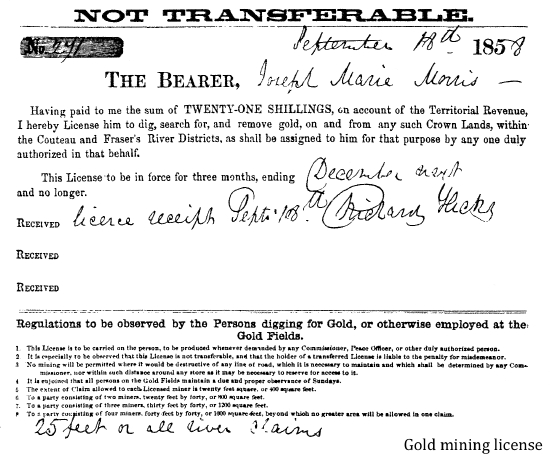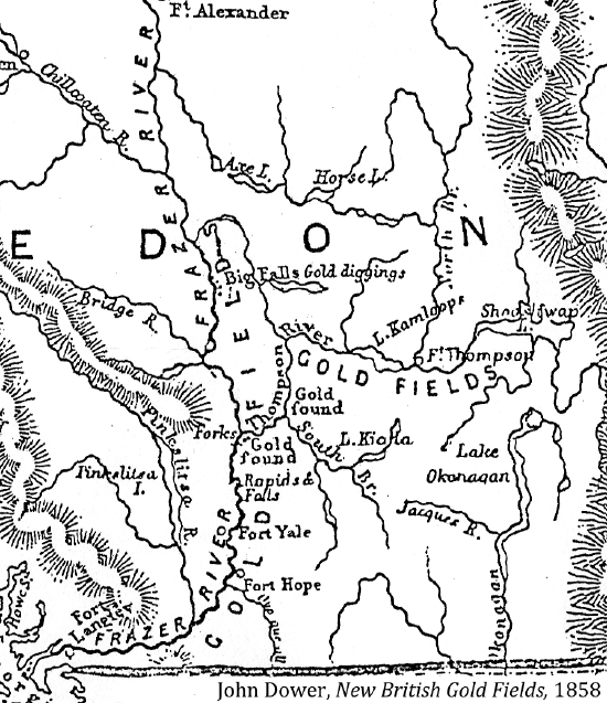 "Gold was first found on Thompson's River by an Indian ¼ of a mile below Nicomin [sic]. The Indian was taking a drink out of the river. Having no vessel, he was quaffing from the stream when he perceived a shining pebble which he picked up and it proved to be gold. The whole tribe forthwith began to collect the glittering metal."