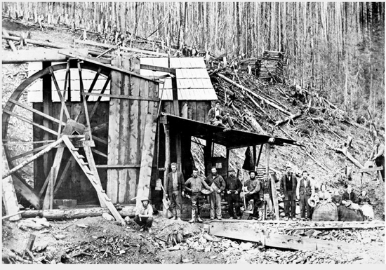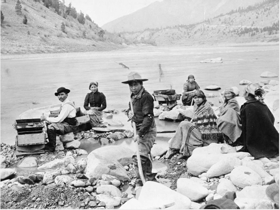 A First Nations family placer mining with sluice boxes and gold pans at the confluence of the Thompson and Fraser River near Lytton, British Columbia Archives, D-06815, 1890