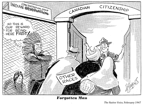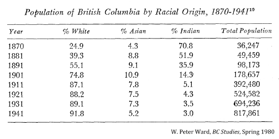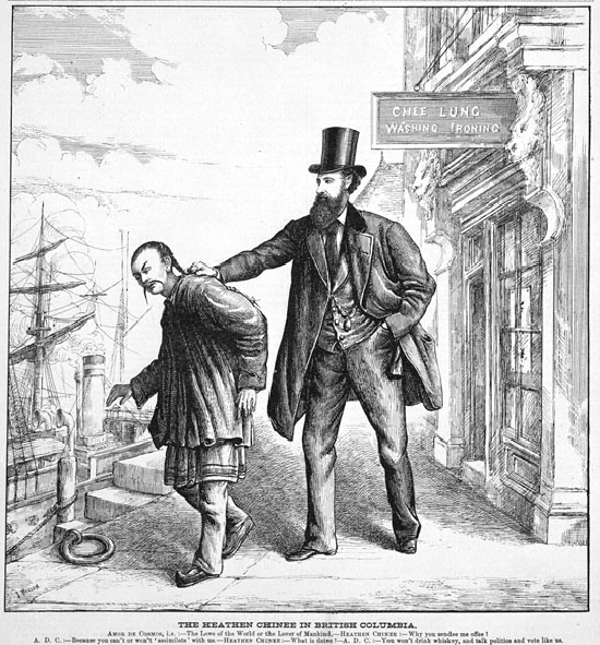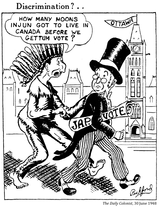 [In 1872, the first British Columbia Legislative Assembly passed the Qualification and Registration of Voters Act, 1872, preventing both Indigenous and Chinese peoples from voting in provincial elections.]