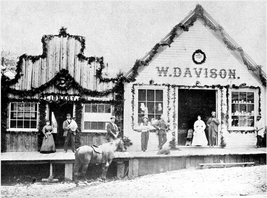 Barkerville Library, with Mr. and Mrs. John Bowron in the doorway, Mr. and Mrs. D. Davison in door of grocery shop, 1 July 1871, BC Archives, A-03770