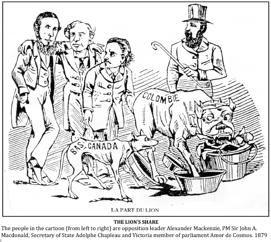 "A Lover of Beauty on his way to Yale:"; a cartoon in sugar of John Gustavus Norris, Amor De Cosmos and Mifflin Wistar Gibbs; delegation to the Confederation League convention in Yale; created by Victoria confectioner Andrew W. Piper. BC Archives, A-01225, 1868