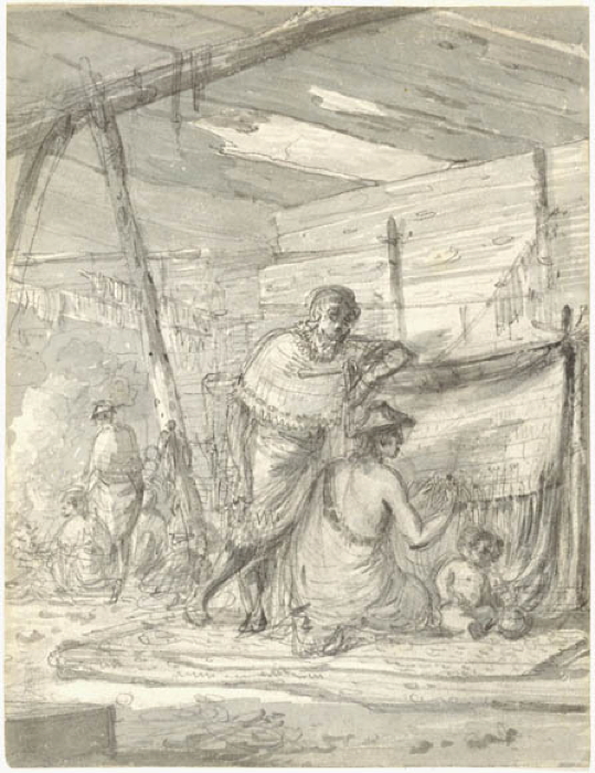 Interior of a House with Women Weaving, Nootka Sound / Femmes en train de tisser dans une habitation du détroit de Nootka. Acc. No. 1991-265-234, John Webber, March 29-April 26, 1778