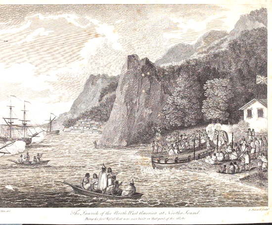 The Launch of the North West America at Nootka Sound. La mise à l'eau du North West America à la baie Nootka. LAC Acc. No. R9266-3477 Collection de Canadiana Peter Winkworth, Conrad Martin Metz, ca. 1790